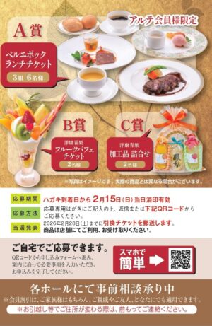 12月25日に、アルテ会員様宛に往復はがきにて応募はがきをお送りしております。