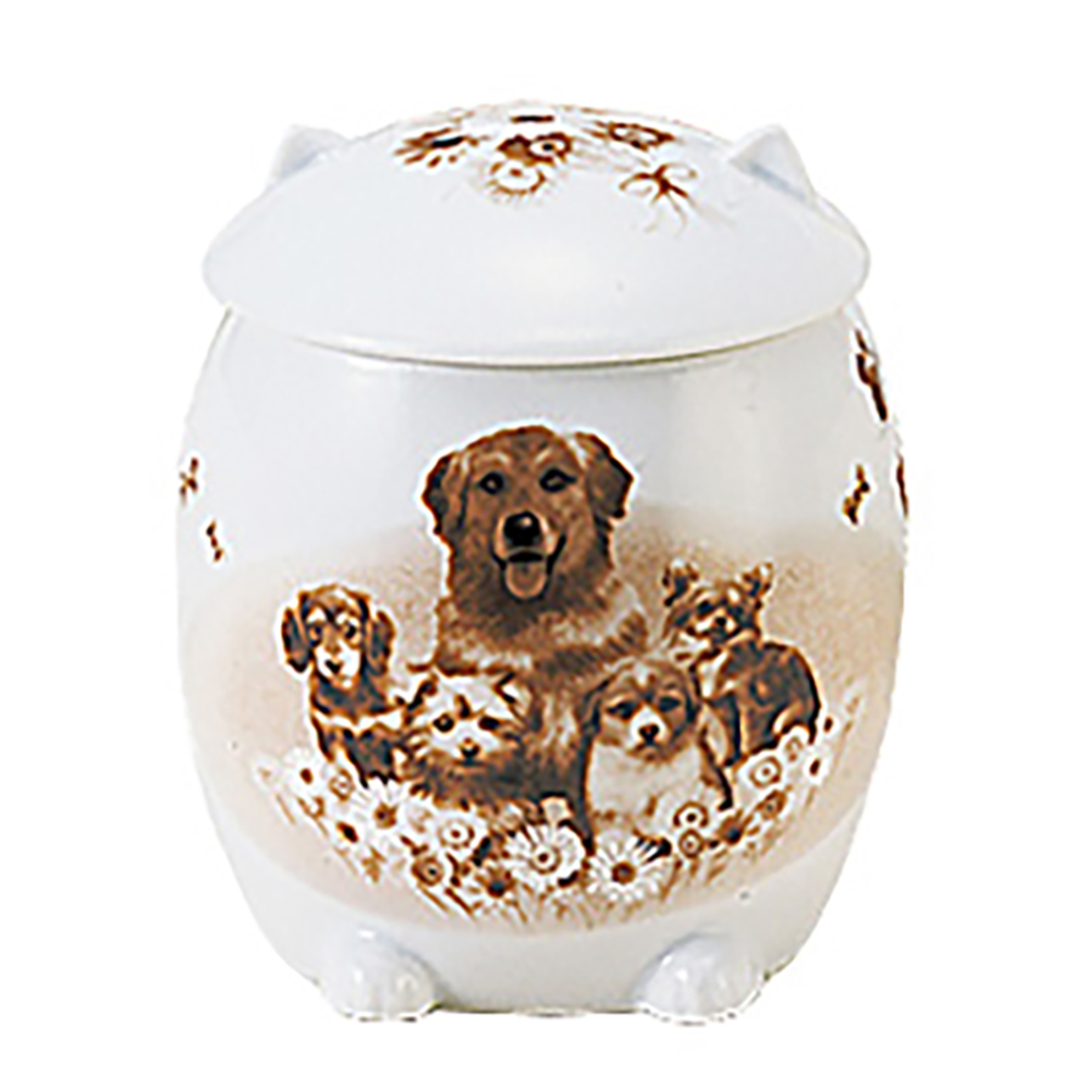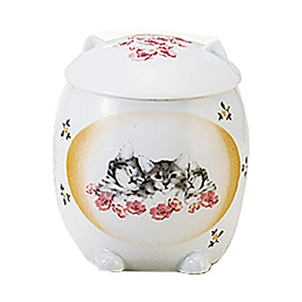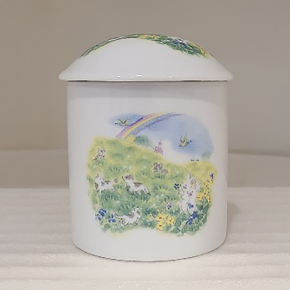 水彩タッチのワンちゃん・ネコちゃん・うさぎちゃん達が蓋と表面に描かれた、ふんわりやさしい印象のお骨壷です。