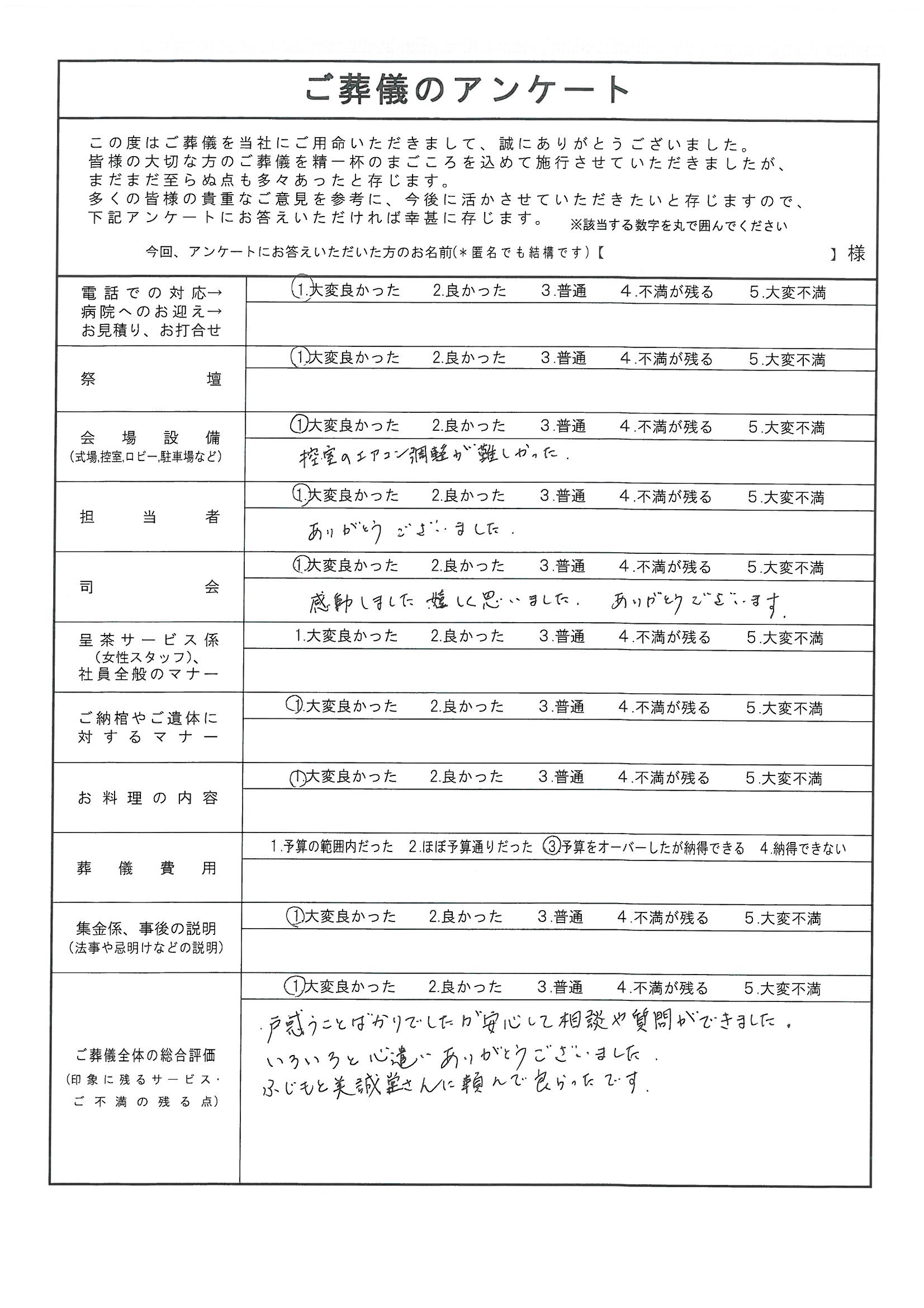 HOME > お客様の声 > お客様の声2019/01/05 | 宮崎市 M様ご葬儀のご依頼をいただいたお客様より弊社のサービス・担当者の対応など、アンケートを通じてお声をいただきました。お客様のお気持ちに寄り添ったご葬儀をご提案出来るように社員一同、これからも更なるサービスの向上に心掛けていきたいと思っております。 お客様担当一同