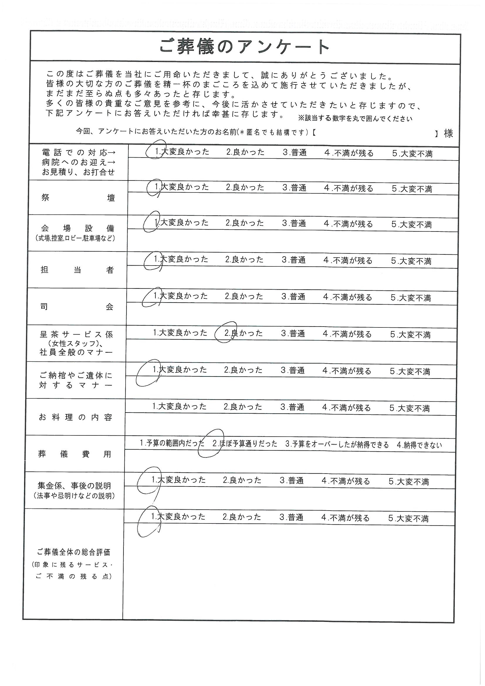 HOME > お客様の声 > お客様の声2019/01/05 | 匿名希望様ご葬儀のご依頼をいただいたお客様より弊社のサービス・担当者の対応など、アンケートを通じてお声をいただきました。 お客様のお気持ちに寄り添ったご葬儀をご提案出来るように社員一同、これからも更なるサービスの向上に心掛けていきたいと思っております。 お客様担当一同