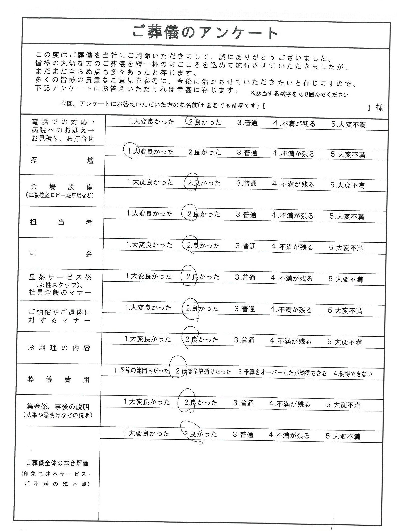 HOME > お客様の声 > お客様の声2019/04/11 | 匿名希望様ご葬儀のご依頼をいただいたお客様より弊社のサービス・担当者の対応など、アンケートを通じてお声をいただきました。お客様のお気持ちに寄り添ったご葬儀をご提案出来るように社員一同、これからも更なるサービスの向上に心掛けていきたいと思っております。 お客様担当者一同