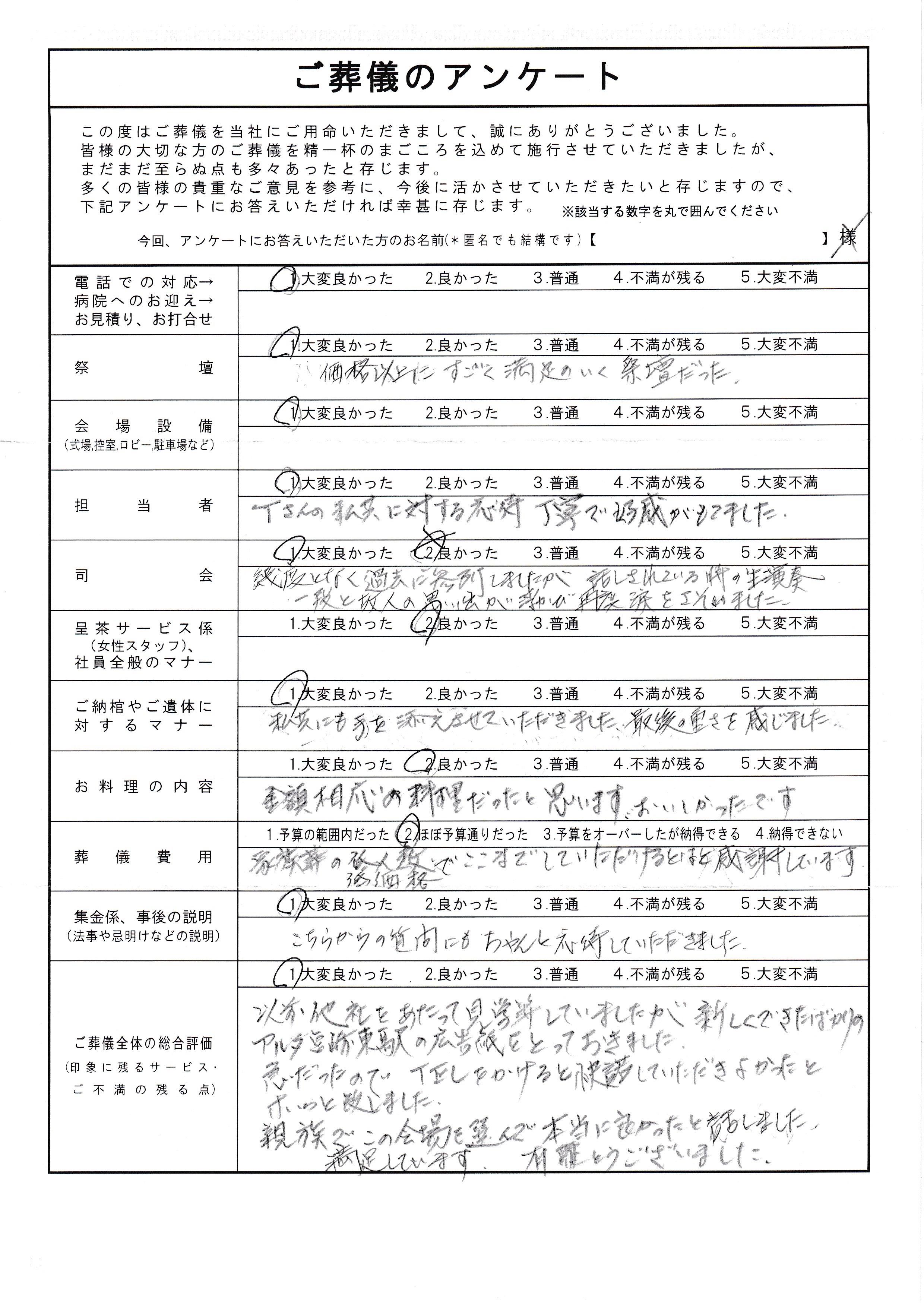 HOME > お客様の声 > お客様の声2019/06/22 | 宮崎市Y様ご葬儀のご依頼をいただいたお客様より弊社のサービス・担当者の対応など、アンケートを通じてお声をいただきました。お客様のお気持ちに寄り添ったご葬儀をご提案出来るように社員一同、これからも更なるサービスの向上に心掛けていきたいと思っております。 お客様係一同