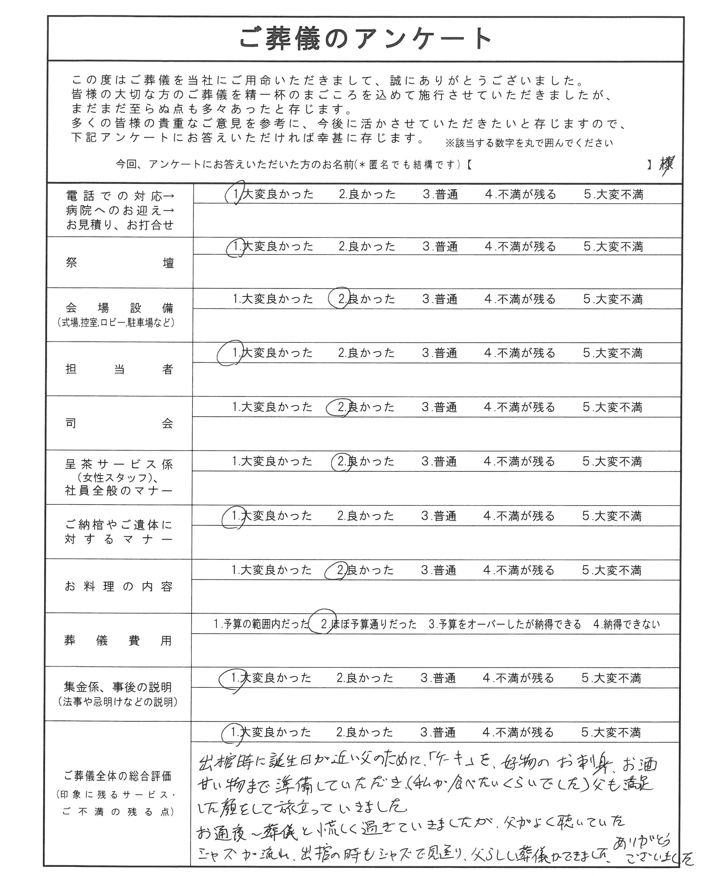 HOME > お客様の声 > お客様の声2020/11/15 | 宮崎市 K様弊社をご利用いただいたお客様より頂戴したアンケートを以下に掲載致します。このたびは、弊社について温かいお言葉をお寄せくださり社員一同感激しております。 今後も「誠を尽くす」をモットーにさらなるサービス向上に尽力してまいります。 社員一同