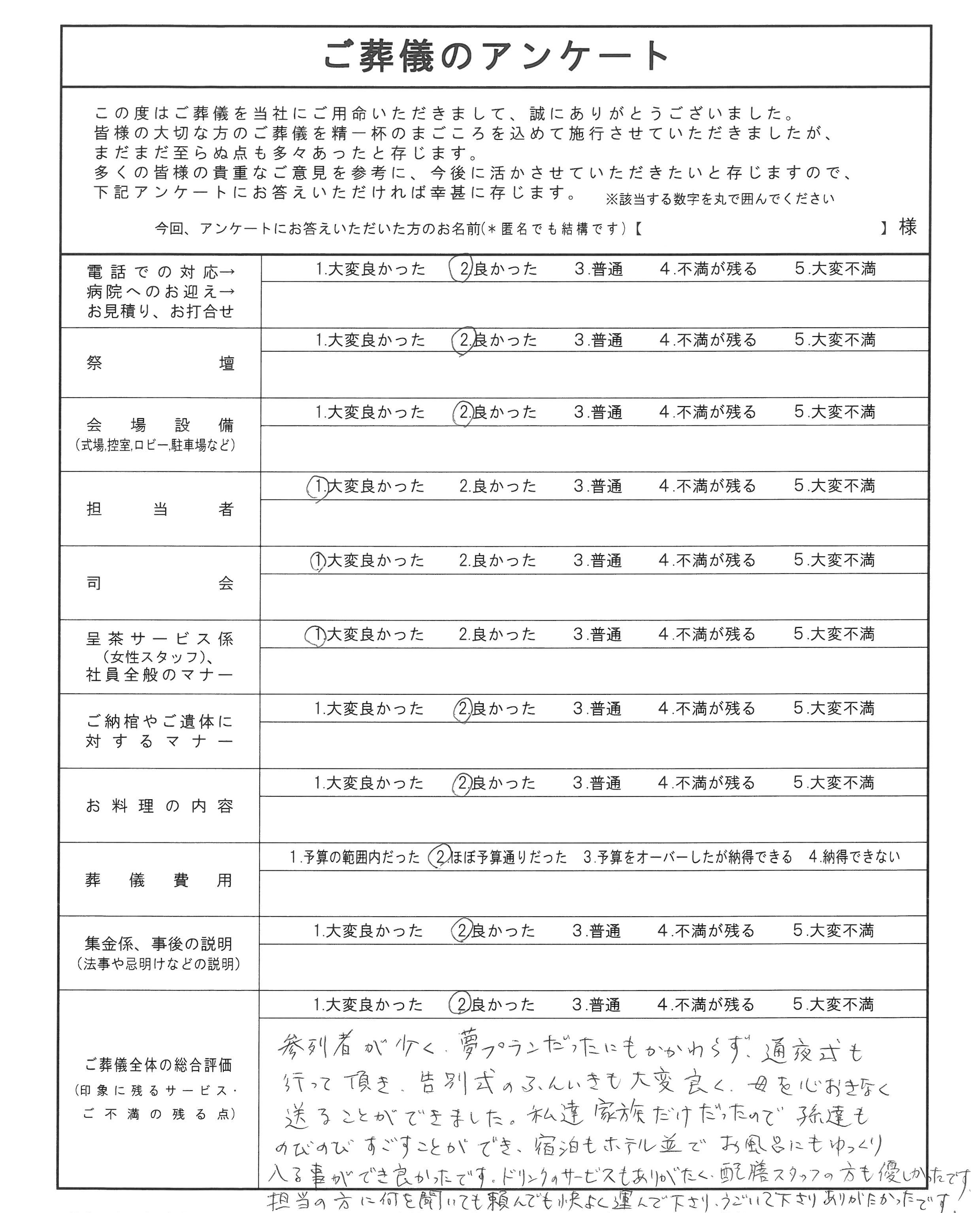 HOME > お客様の声 > お客様の声2021/01/31 | 宮崎市 T様弊社をご利用いただいたお客様より頂戴したアンケートを以下に掲載致します。このたびは、弊社について温かいお言葉をお寄せくださり社員一同感激しております。 今後も「誠を尽くす」をモットーにさらなるサービス向上に尽力してまいります。 社員一同
