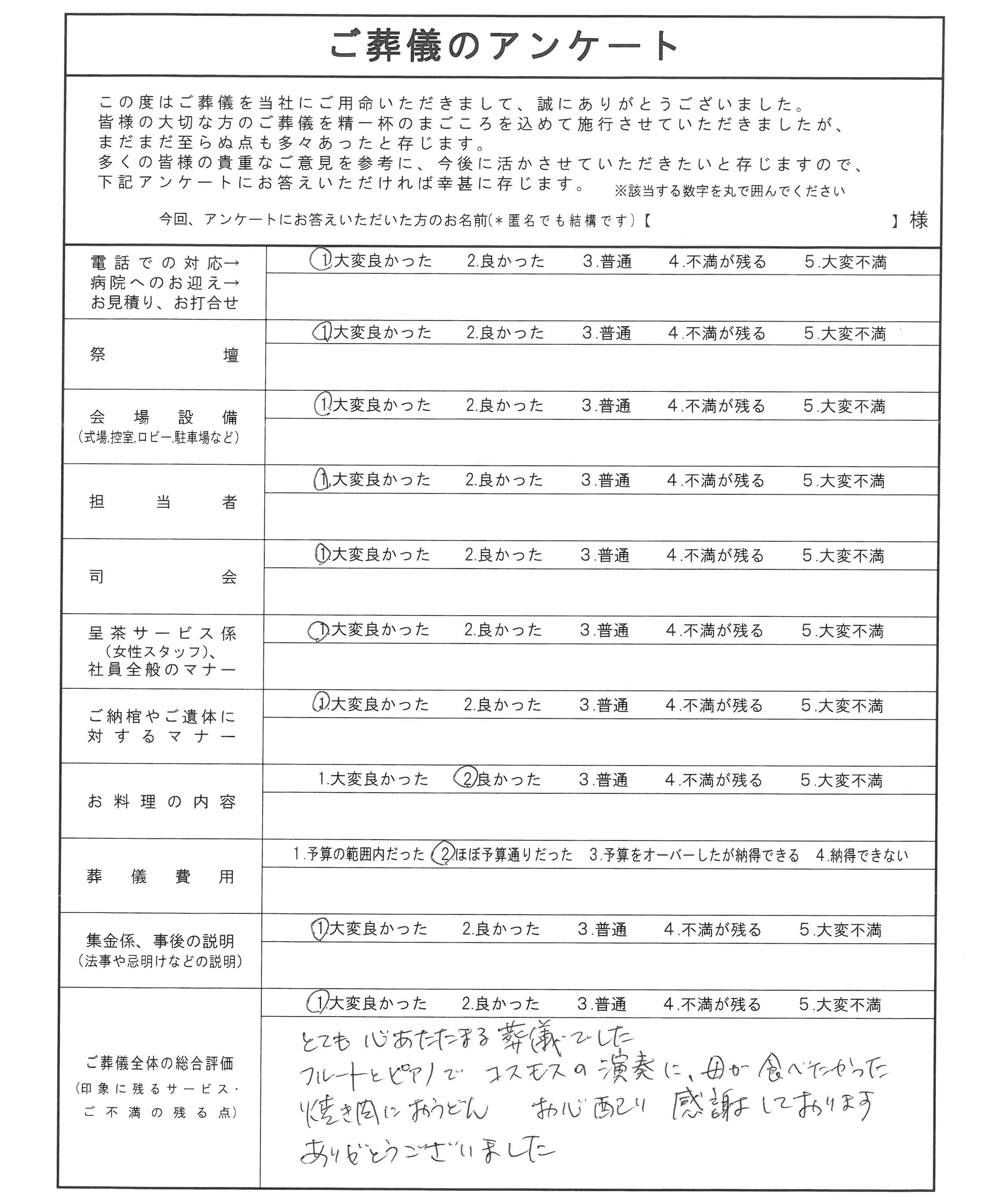 HOME > お客様の声 > お客様の声2021/02/19 | 宮崎市 N様弊社をご利用いただいたお客様より頂戴したアンケートを以下に掲載致します。このたびは、弊社について温かいお言葉をお寄せくださり社員一同感激しております。 今後も「誠を尽くす」をモットーにさらなるサービス向上に尽力してまいります。 社員一同