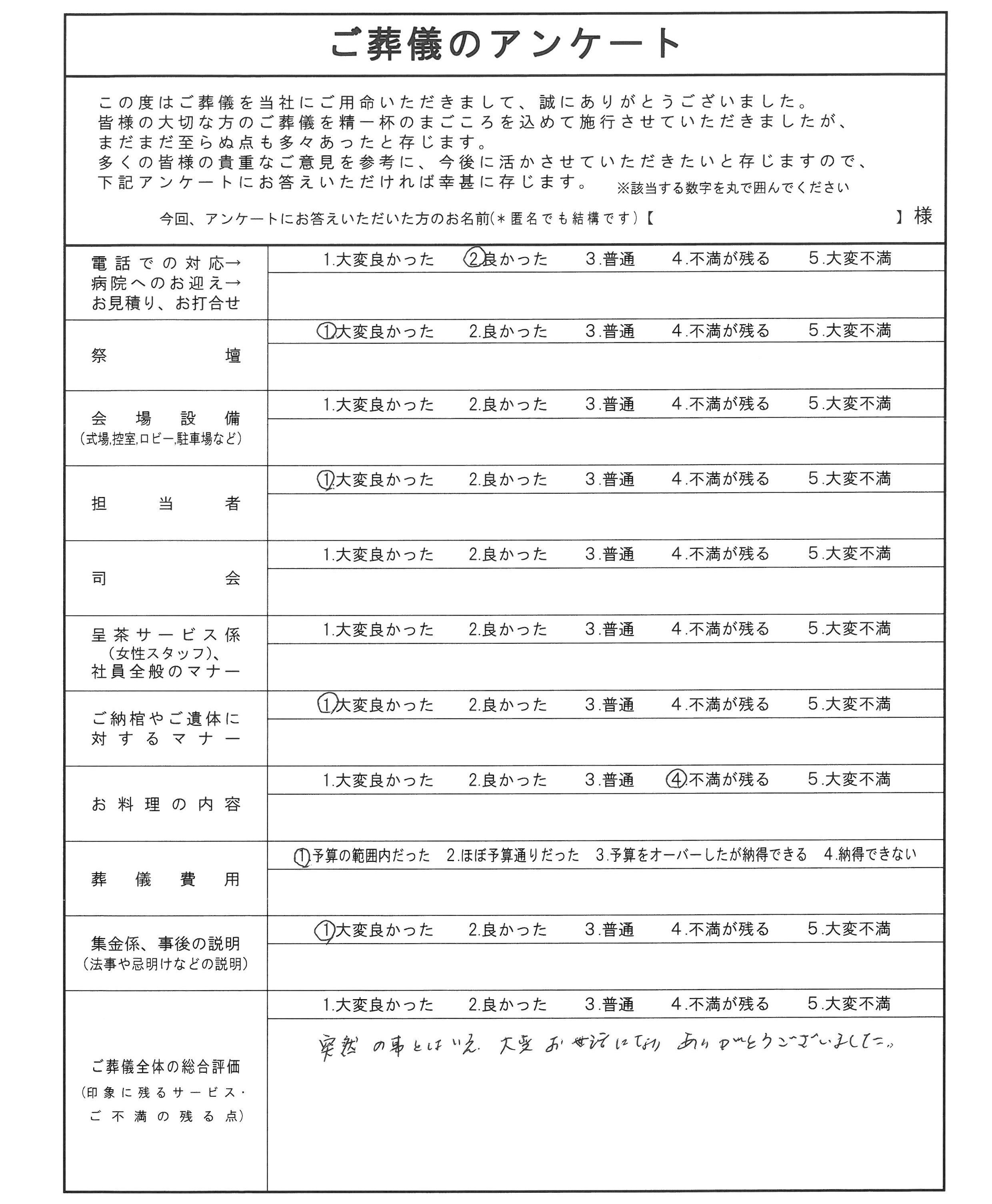 HOME > お客様の声 > お客様の声2021/02/24 | 宮崎市 K様弊社をご利用いただいたお客様より頂戴したアンケートを以下に掲載致します。このたびは、弊社について温かいお言葉をお寄せくださり社員一同感激しております。 今後も「誠を尽くす」をモットーにさらなるサービス向上に尽力してまいります。 社員一同
