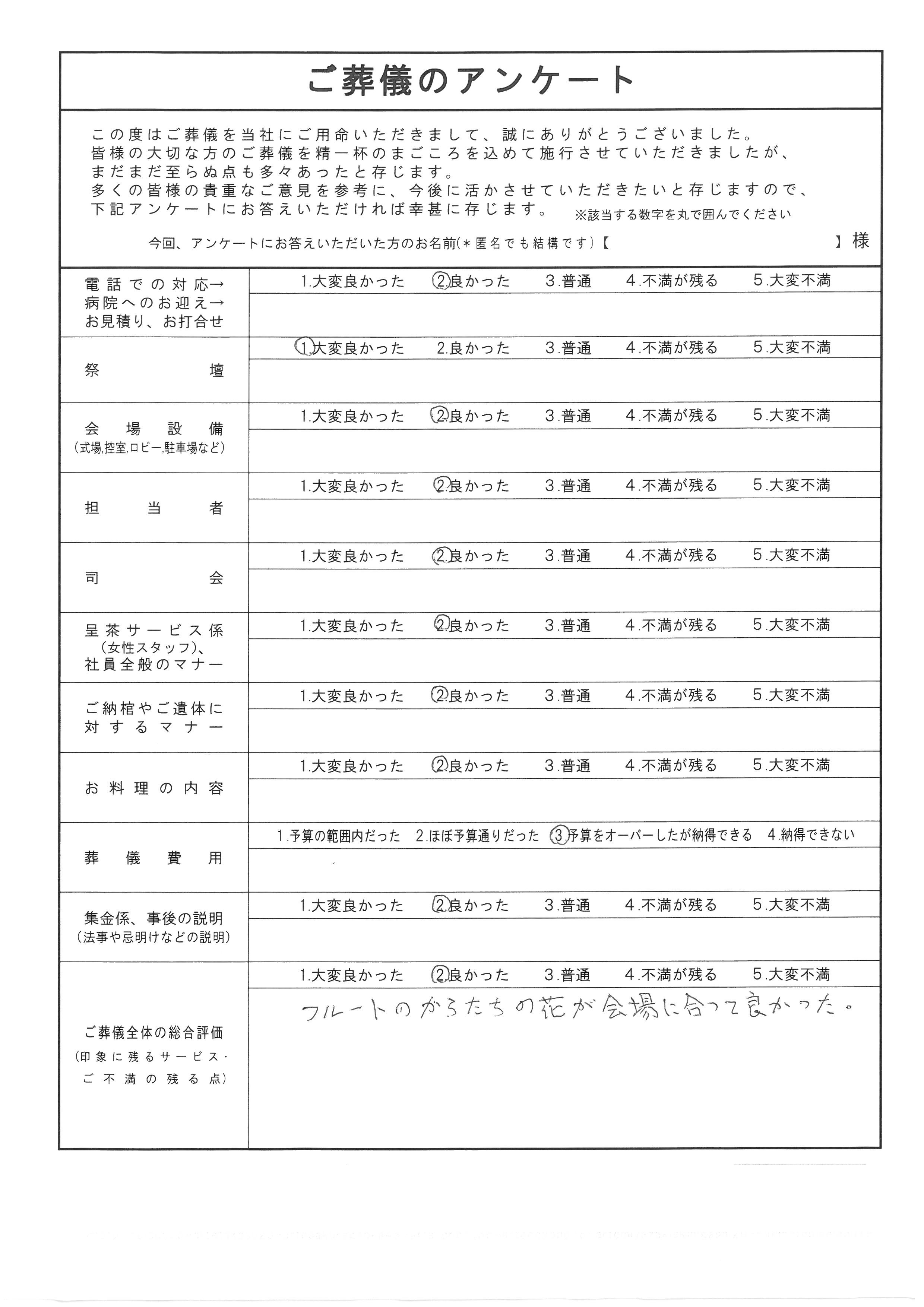 HOME > お客様の声 > お客様の声2021/05/17 | 宮崎市 T様弊社をご利用いただいたお客様より頂戴したアンケートを以下に掲載致します。お客様のお気持ちに寄り添ったご葬儀をご提案出来るようにこれからも更なるサービスの向上に心掛けていきたいと思っております。 社員一同