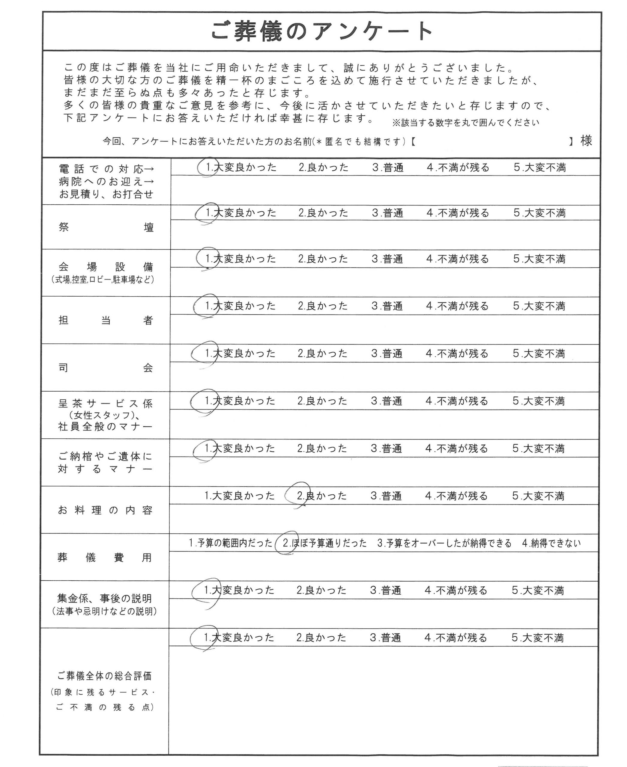 HOME > お客様の声 > お客様の声2021/10/10 | 宮崎市 I様弊社をご利用いただいたお客様より頂戴したアンケートを以下に掲載致します。お客様のお気持ちに寄り添ったご葬儀をご提案出来るようにこれからも更なるサービスの向上に心掛けていきたいと思っております。 社員一同