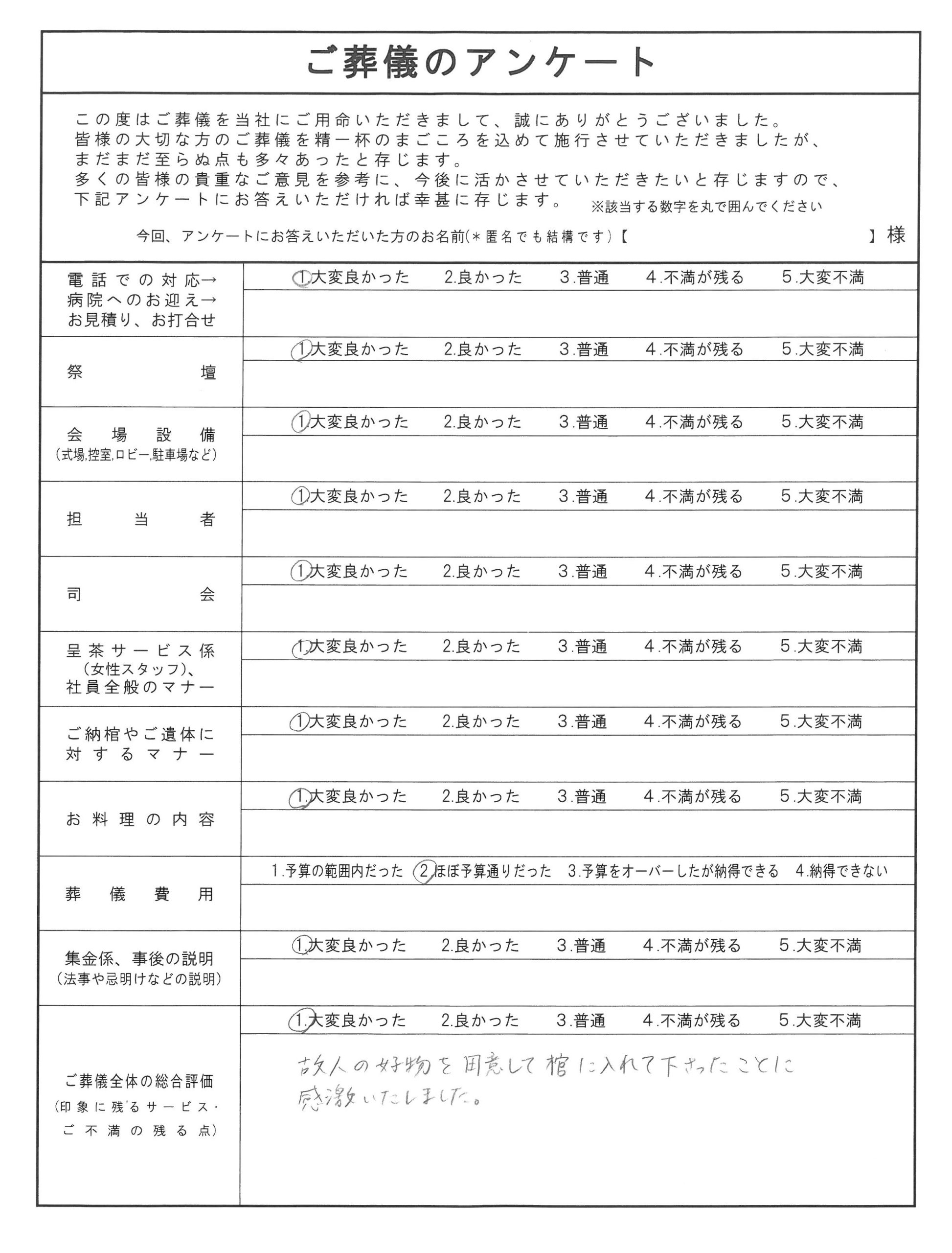 HOME > お客様の声 > お客様の声2022/04/18 | 宮崎市 M様弊社をご利用いただいたお客様より頂戴したアンケートを以下に掲載致します。お客様のお気持ちに寄り添ったご葬儀をご提案出来るようにこれからも更なるサービスの向上に心掛けていきたいと思っております。 社員一同