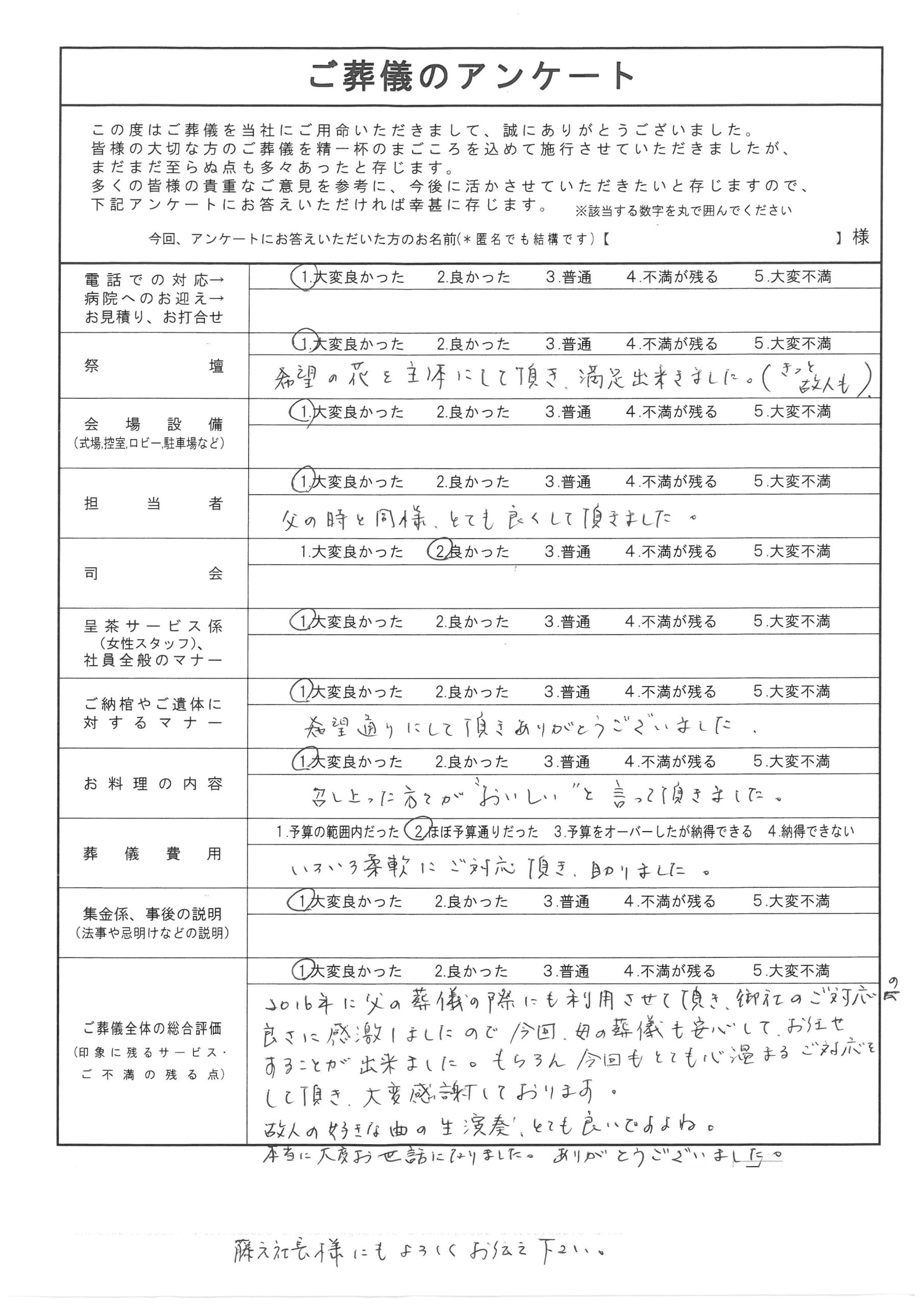 HOME > お客様の声 > 2022/05/10 | 宮崎市 K様弊社をご利用いただいたお客様より頂戴したアンケートを以下に掲載致します。お客様のお気持ちに寄り添ったご葬儀をご提案出来るようにこれからも更なるサービスの向上に心掛けていきたいと思っております。 社員一同