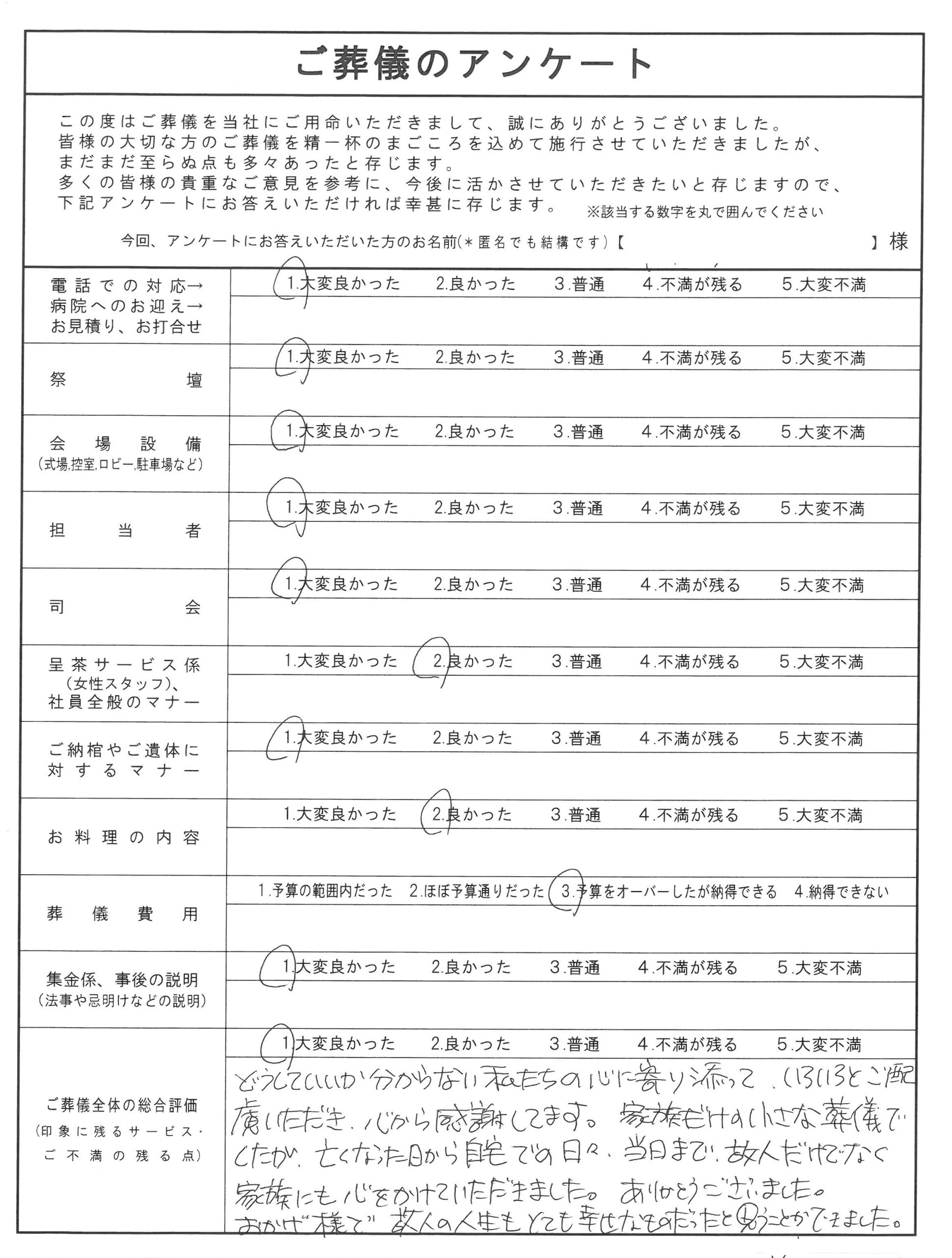 HOME > お客様の声 > お客様の声2022/08/31 | 宮崎市 N様弊社をご利用いただいたお客様より頂戴したアンケートを以下に掲載致します。お客様のお気持ちに寄り添ったご葬儀をご提案出来るようにこれからも更なるサービスの向上に心掛けていきたいと思っております。 社員一同