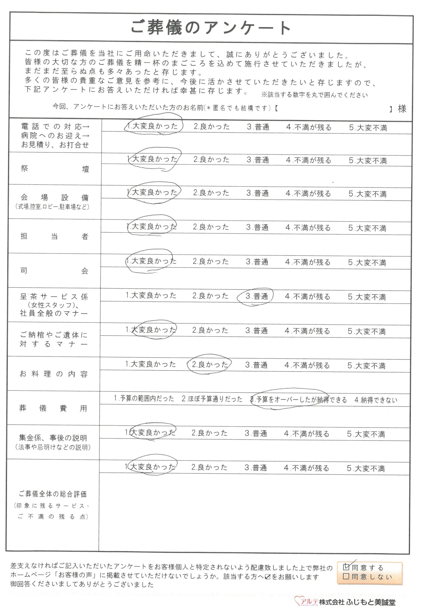HOME > お客様の声 > 2022/11/28 | 宮崎市U様弊社をご利用いただいたお客様より頂戴したアンケートを以下に掲載致します。お客様のお気持ちに寄り添ったご葬儀をご提案出来るようにこれからも更なるサービスの向上に心掛けていきたいと思っております。 社員一同