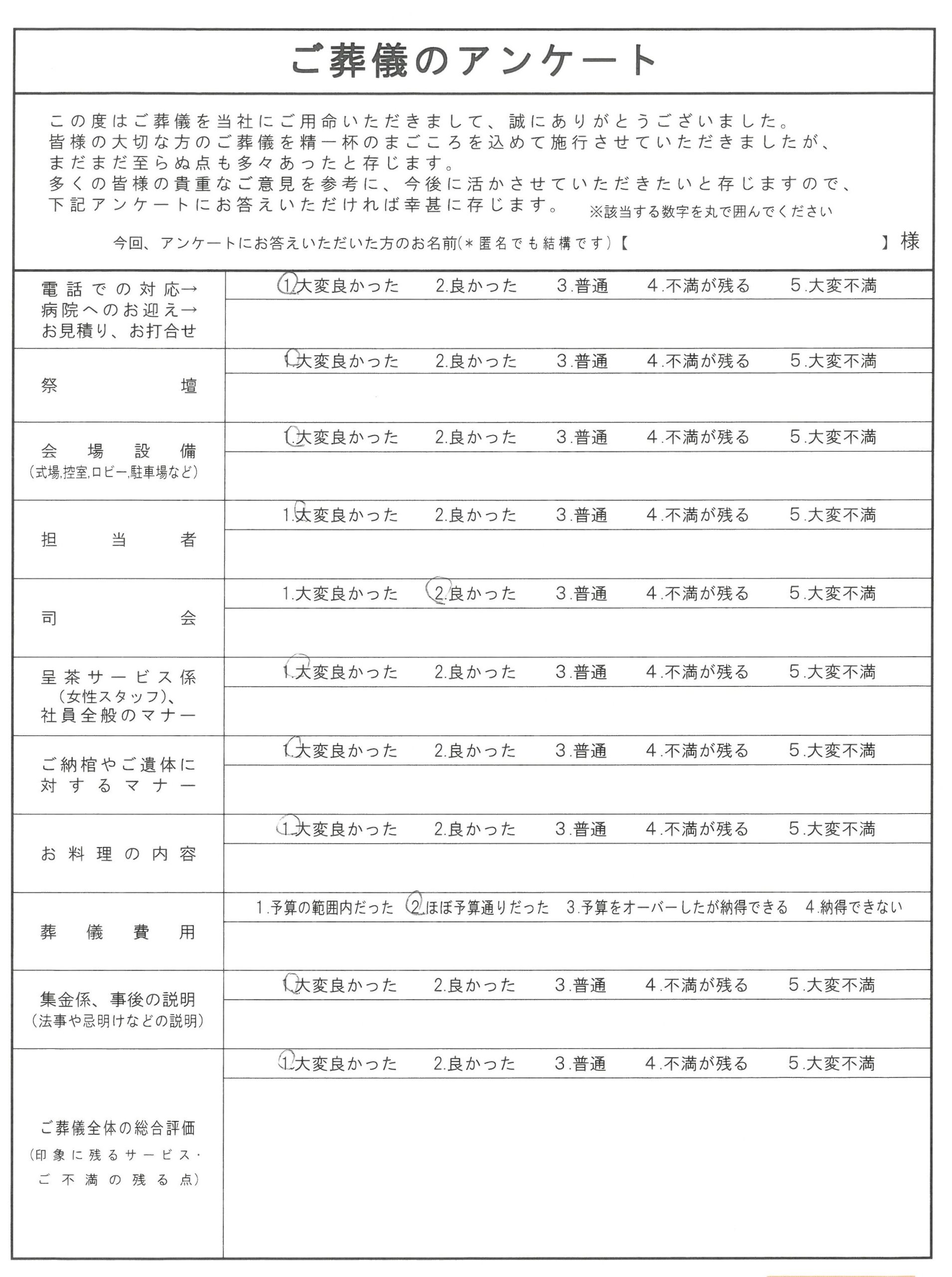 HOME > お客様の声 > お客様の声2023/02/21 | 匿名希望様弊社をご利用いただいたお客様より頂戴したアンケートを以下に掲載致します。お客様のお気持ちに寄り添ったご葬儀をご提案出来るようにこれからも更なるサービスの向上に心掛けていきたいと思っております。 社員一同