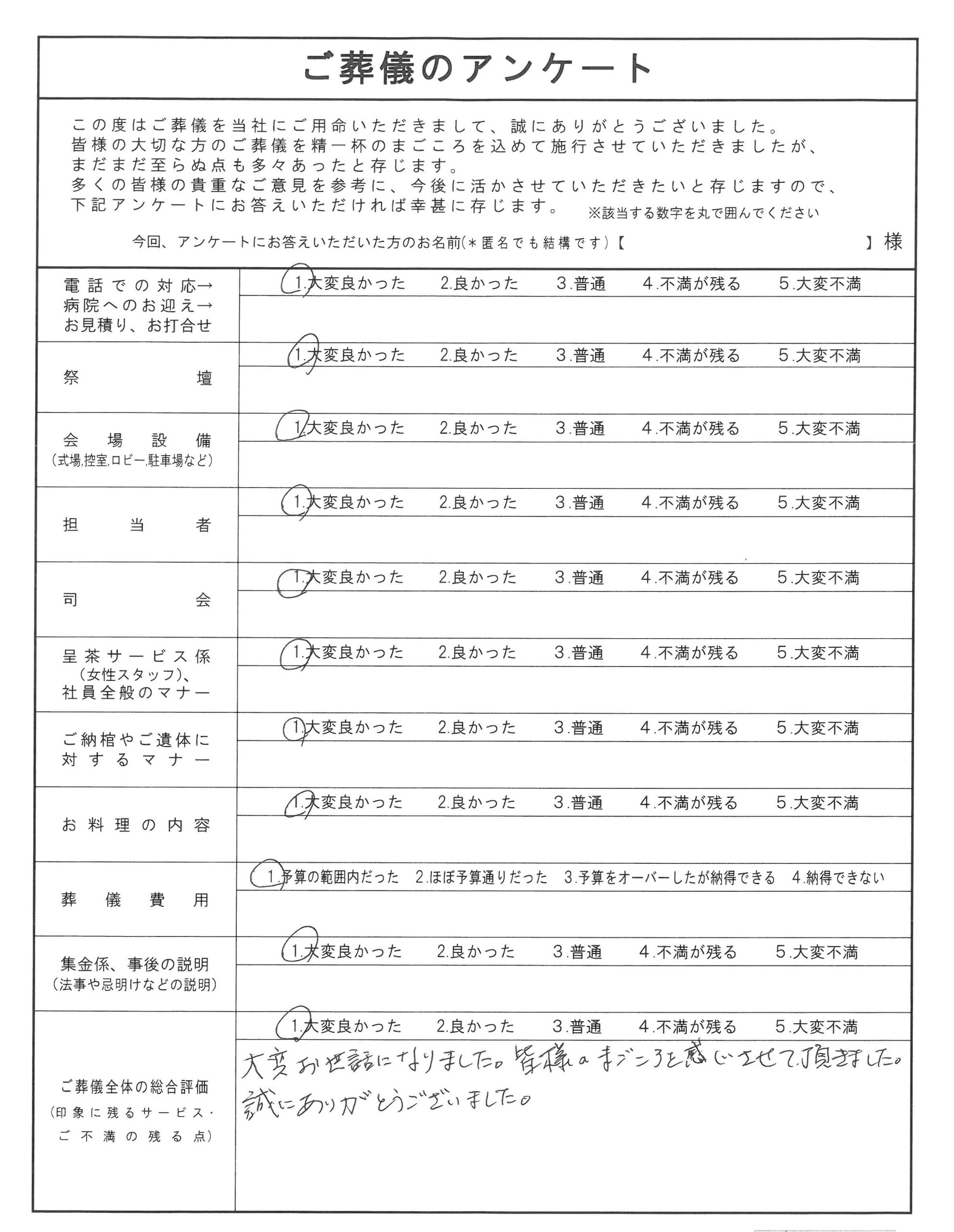HOME > お客様の声 > お客様の声2023/03/30 | 匿名希望様弊社をご利用いただいたお客様より頂戴したアンケートを以下に掲載致します。 お客様のお気持ちに寄り添ったご葬儀をご提案出来るようにこれからも更なるサービスの向上に心掛けていきたいと思っております。 社員一同